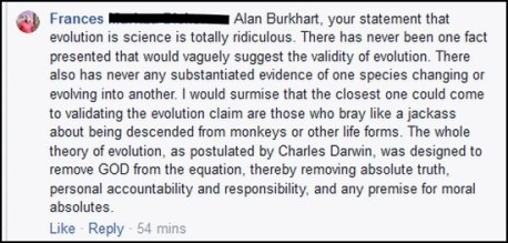 The screen capture shown here is from some crazy woman who’s buried so deeply in the dogma that she tried to hijack an otherwise civil conversation on Facebook. A few of us were discussing / debating evolution vs creationism. But then “Francis” apparently felt butt-hurt over it all and chimed in with a flood of hate and stupidity.